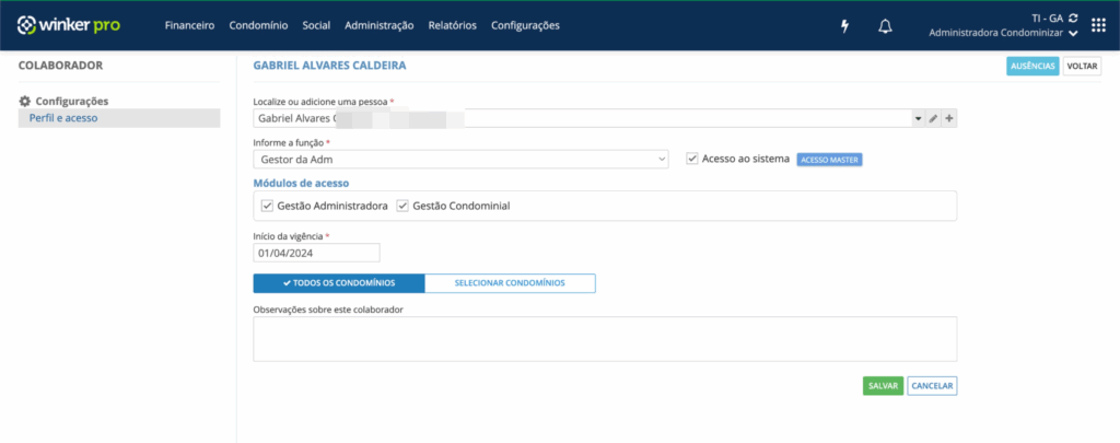 Somente o Usuário Master poderá liberar acesso aos novos módulos do sistema, como o módulo “Gestão da Administradora”, que será lançado em breve.
