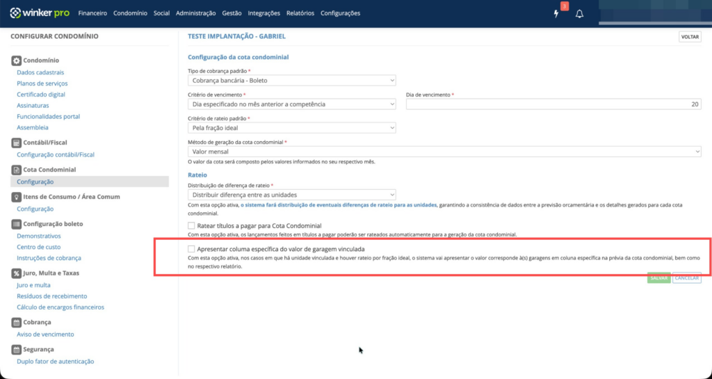 Com essa opção ativa, nos casos em que houver unidades com garagens vinculadas e o rateio for realizado por fração ideal, o sistema passará a:
